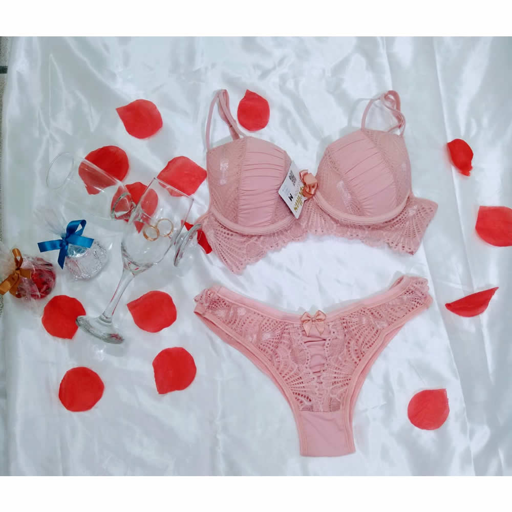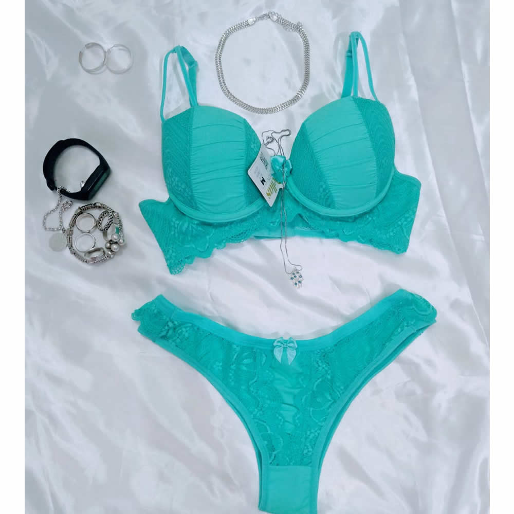 Belíssimo e confortável conjunto push up, de renda drapeada, com laço, produzido em microfibra.
